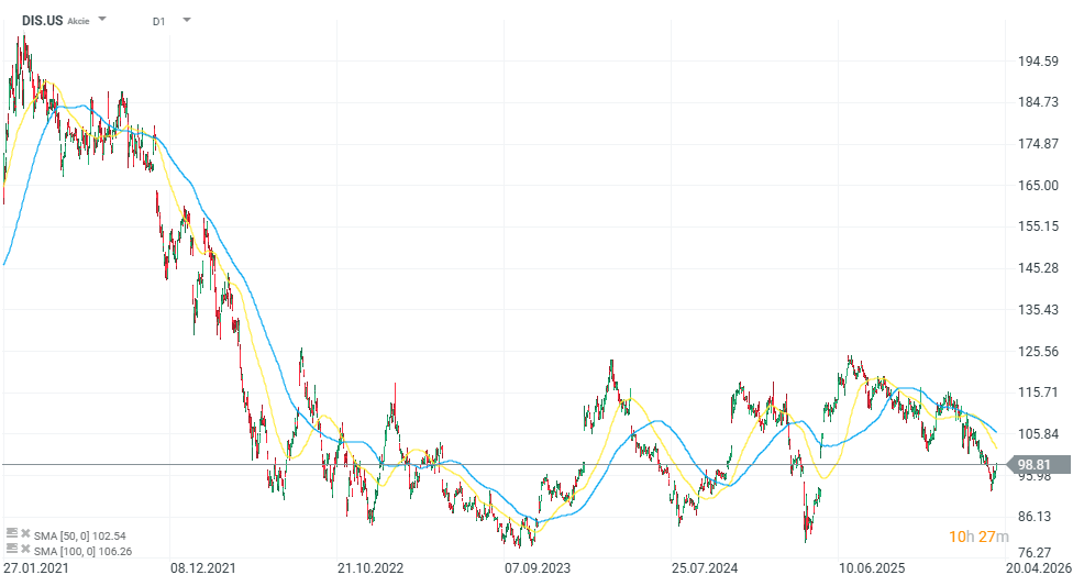 Z hlediska vývoje ceny akcií Disney stále nedosáhlo maxim z roku 2021, kdy se akcie obchodovaly kolem 200 USD. Od té doby si firma prochází výrazným poklesem a akcie se nyní obchodují těsně pod 100 USD. Na minimech se titul v posledních letech obchodoval v roce 2023, kdy byla cena akcií pod 80 USD. Z nejnižších úrovní tak akcie přidaly přibližně 25 %, stále ale obchodují zhruba 50 % pod maximy z roku 2021.