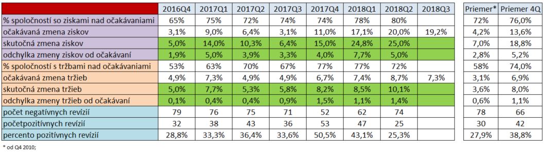 Posledná výsledkový sezóna za druhý kvartál bola silná. Prognózy ziskov prekonalo až 80% spoločností, čo je najviac v histórii štatistiky od roku 2010. Takisto bol zaznamenaný aj najsilnejší rast ziskov od roku 2010, o 25%. Primárne za to môžu nižšie korporátne dane, svoje však zohráva aj silná ekonomika. Ukazujú to tržby (na nich dane nemajú vplyv), ktoré rástli medziročne o 10,1%, najrýchlejšie od roku 2011.