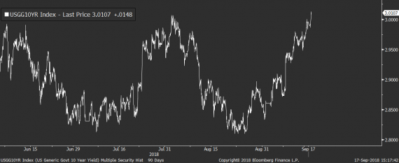 Mírného růstu se dnes dočkaly opět výnosy dluhopisů, které se u 10letých splatností v USA přehouply přes hranici 3 %. Dostávají se tak na úrovně z konce července, což ale zatím obchodníky nechává klidnými. V případě jejich dalšího růstu však jejich úroveň může představovat problém s přesahem také na akciové trhy.