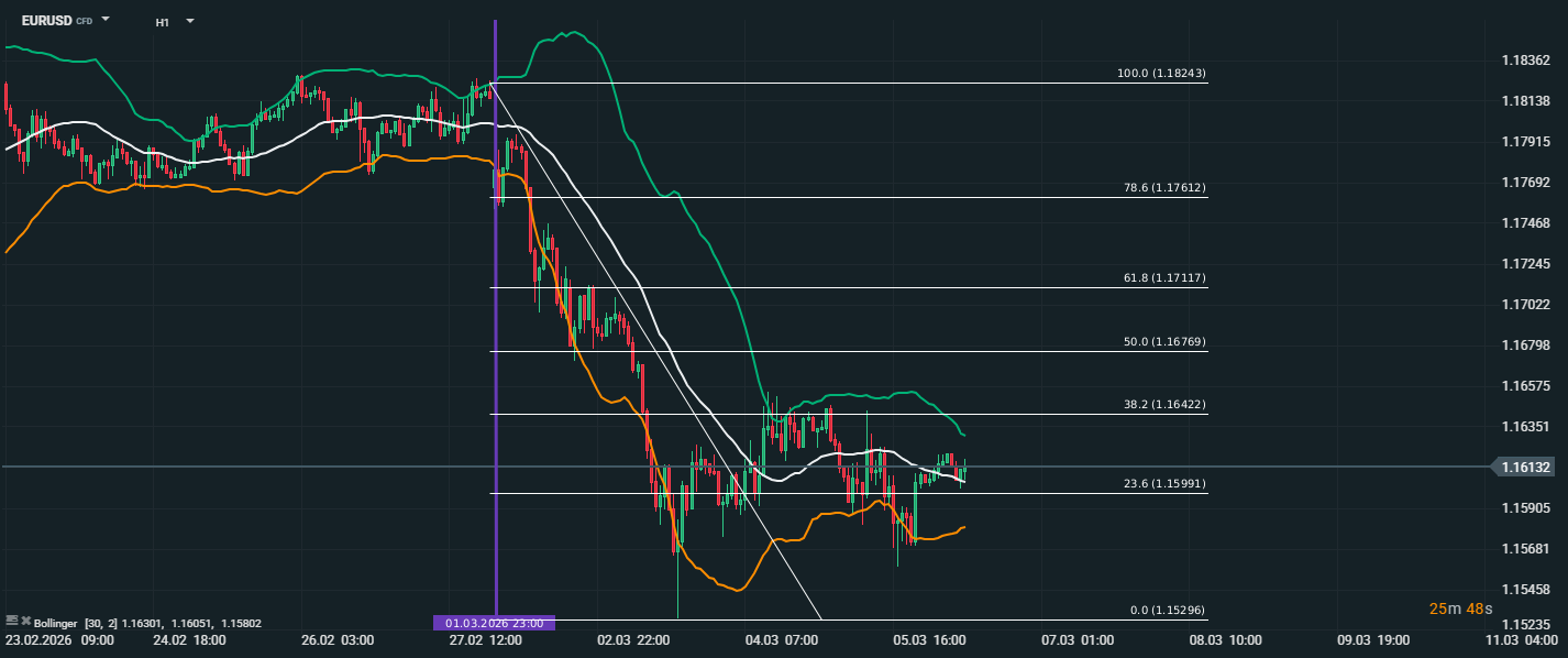 Měnový pár EUR/USD se aktuálně obchoduje kolem 1,16132 a po předchozím poklesu se snaží stabilizovat nad důležitou Fibonacciho úrovní 23,6 % na ceně 1,15991. Trh se zatím drží pod hladinou 38,2 % na 1,16422, která nyní představuje nejbližší rezistenci. To ukazuje, že euro je vůči dolaru stále pod tlakem a kupci zatím nemají dost síly na výraznější obrat. Z technického pohledu je důležité, že kurz zůstává poměrně blízko spodní části sledovaného rozpětí mezi minimem 1,15296 a maximem 1,18243. Pokud by se EUR/USD dokázal vrátit nad 1,16422, otevřel by si prostor k dalšímu růstu směrem k úrovni 1,16769 a následně k 1,17117, kde leží další Fibonacciho bariéry. Naopak ztráta podpory na 1,15991 by zvýšila riziko návratu k minimu 1,15296.
