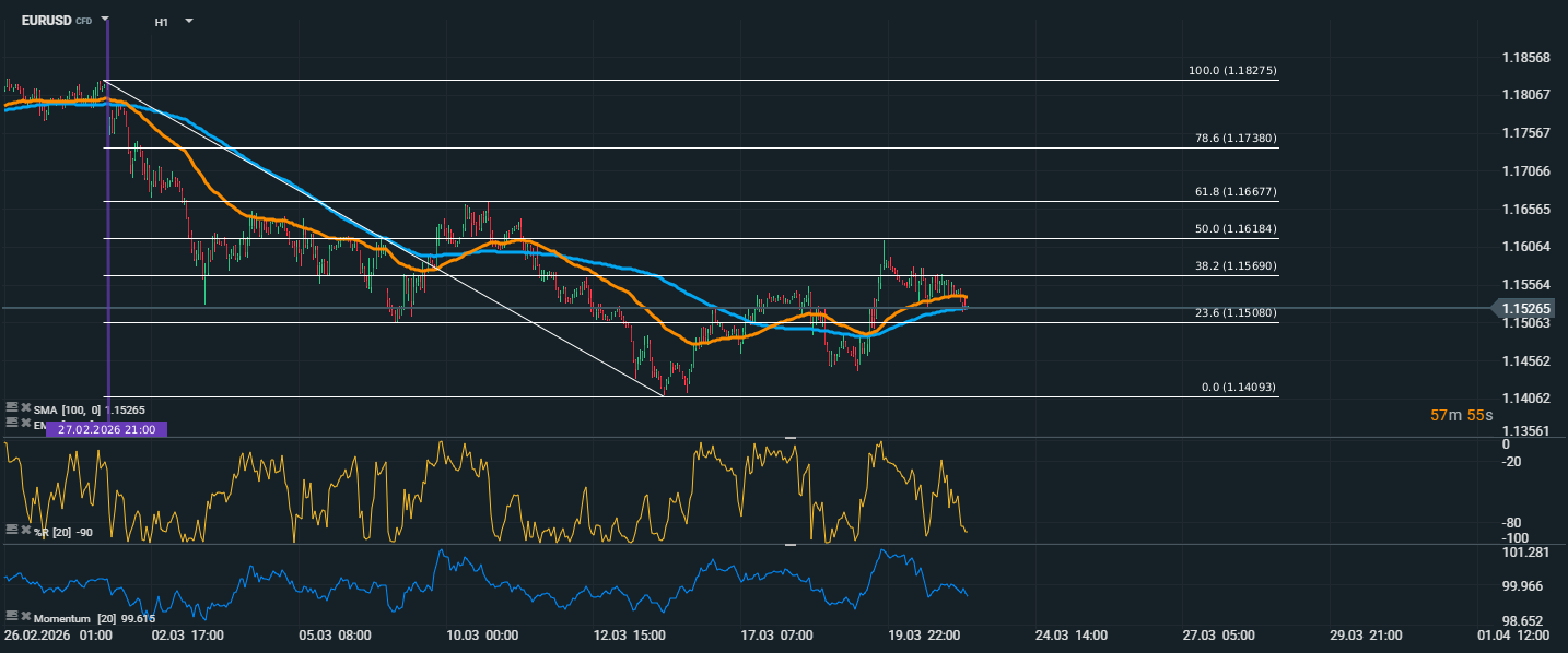 Z technického pohledu je patrné, že trh sice po předchozím propadu našel krátkodobou stabilizaci, ale síla býků zatím není dostatečná pro výraznější průraz výše. Cena se pohybuje v těsné blízkosti klouzavých průměrů EMA 50 a SMA 100, což ukazuje na nerozhodnost trhu a chybějící jasný trend. Pokud by eurodolar neudržel oblast kolem 1,1508, zvýšilo by se riziko návratu k supportu poblíž 1,1409, což je zároveň lokální minimum sledovaného pohybu. Naopak pro zlepšení technického obrazu by bylo potřeba návrat nad 1,1569 a následně potvrzený průraz nad 1,1618. Dokud se to nestane, zůstává pár spíše v konsolidaci s mírně negativním nádechem.