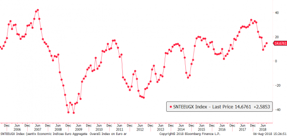Z makra dnešek přinesl jen index Sentix, který vyjadřuje důvěru investorů v eurozóně a který jen nepatrně vzrostl z 12,1b. na 14.7b. Dopad na trhy byl ale nulový.