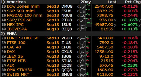 Začátek týdne na trzích zatím probíhá v poklidu a na nízkých objemech. Ekonomický kalendář je na data chudý a trhy tak ve většině případů jen přešlapují na místě a čekají na nové impulsy. Hlavní témata na trzích jsou nadále politická, ale rizika spojená např. s obchodními vztahy mezi Čínou a USA zatím na západní trhy větší dopad nemají a tak dnes evropské indexy i futures na indexy v USA ve většině případů jen udržují pozice, nebo nepatrně ztrácí.