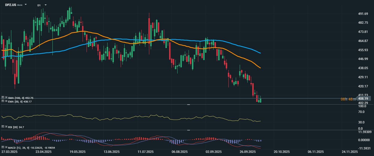 Akcie Domino’s Pizza Inc. zaznamenaly silný růst v předobchodní fázi poté, co společnost oznámila lepší než očekávané výsledky za třetí čtvrtletí, a to díky zvýšené poptávce po marketingových akcích a inovaci s plněným okrajem pizzy. Akcie stouply až o 5,8 %, přičemž od začátku roku byly do pondělí ve ztrátě 2,7 %.
