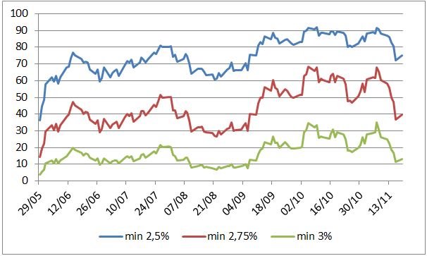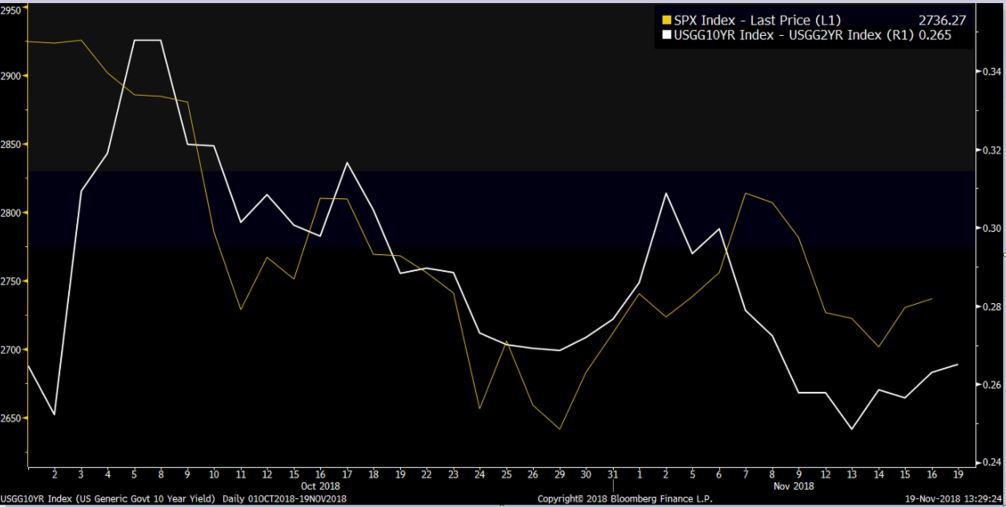 Súvisí to s tým, že trhy očakávajú v súvislosti s negatívnou náladou na trhoch pomalšie zvyšovanie úročenia. Pekne je to vidno v nasledujúcom grafe, v ktorom je zobrazená výnosová krivka (čo je rozdiel medzi 10-ročným a 2-ročným úročením štátnych dlhopisov) a index S&P. Je pekne vidno, ako tieto dva časové rady od prvých výpredajov začiatkom októbra nabrali spoločný smer.
