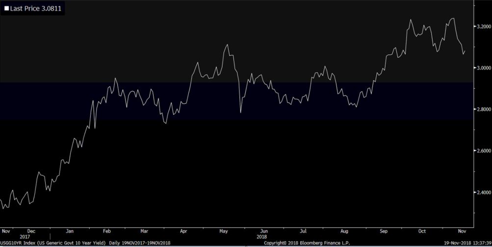 Kým od začiatku októbra až do začiatku novembra sa počítalo s tým, že koncom budúceho roka budú úrokové sadzby v pásme 2,75-3% (aktuálne sú v pásme 2-2,25%), tak po novom je to len v pásme 2,5-3%. Keďže FED s najväčšou pravdepodobnosťou v decembri ešte raz zvýši sadzby, tak v budúcom roku aktuálne trhy očakávajú len jedno zvýšenie. FED na svojom septembrovom zasadnutí počítal s troma.