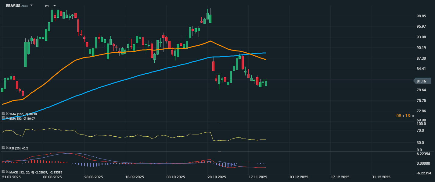 Akcie společnosti eBay se v posledních dnech obchodují v sestupném trendu a aktuálně se pohybují na ceně 81,16 USD. Tato úroveň je hluboko pod klouzavými průměry – EMA 50 (86,97 USD) a SMA 100 (88,79 USD). RSI dosahuje hodnoty 40,2, tedy blízko pásma přeprodanosti, což naznačuje oslabující nákupní zájem a riziko pokračujícího poklesu. Naopak mírný růstový odraz z posledních dní může být jen krátkodobou technickou korekcí.