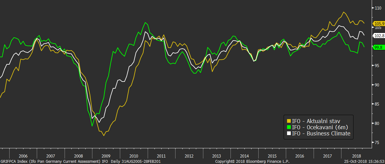 Z ostatních fundamentů jsme se dnes dočkali ještě německého indexu IFO, který po vzoru včerejších PMI podstřelil většinový konsenzus, a zklamání přinesly také výsledky amerických nových objednávek. Ty v jádrové podobě rostly v minulém měsíci pouze o 0,1 %, zatímco trh doufal v růst o 0,5 %.