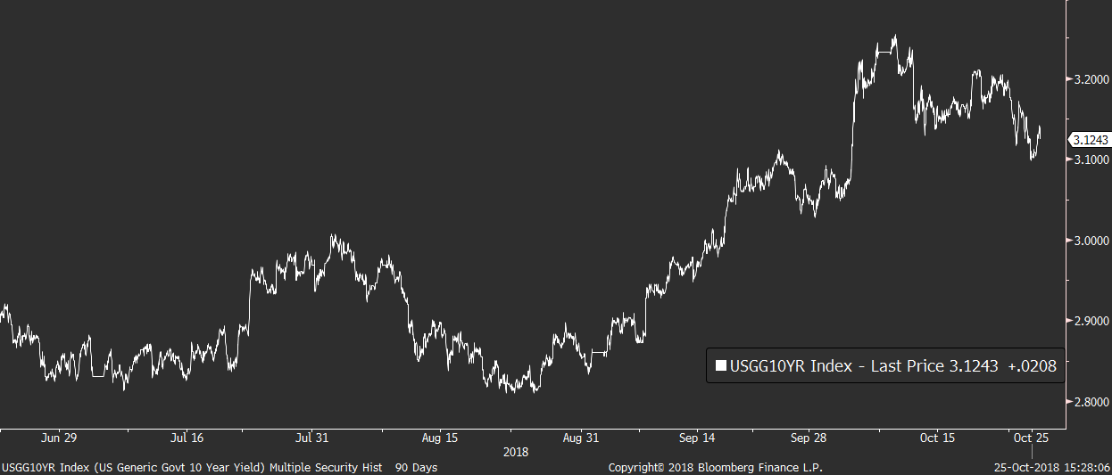 Dobrou zprávou pro ocenění akcií a ostatních rizikových aktiv je zatím dění na trhu s dluhopisy, ke kterým se investoři začali včera znovu uchylovat jako k bezpečným přístavům. Výnosy z amerických 10letých dluhopisů klesly na 3,13 % a dál tak signalizují, že trh v další výraznější růst dlouhodobých sazeb prozatím nevěří. Byl to přitom právě růst dlouhého konce výnosové křivky, který byl hlavním motorem únorového a teď i říjnového výplachu na akciových trzích.
