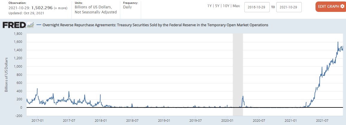 Masivní nárůst likvidity drží rally na akciových trzích. I pokud by se Fed rozhodl v tomto týdnu snížit objem nákupů dluhopisů, tak likvidita jen tak neklesne. Zdroj: Fred