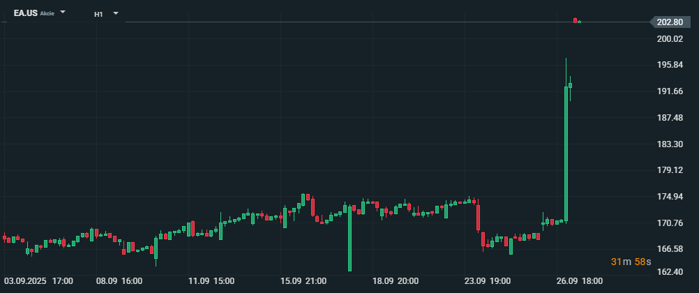 Akcie EA po zveřejnění informací o převzetí prudce vzrostly – o více než 14–15 %. Někteří analytici ale varují, že hodnocení je agresivní a ponechává málo prostoru pro chyby. Riziko představuje i schvalovací proces, zahraniční investoři a tlak na efektivní implementaci nové strategie. Zdroj: xStation5