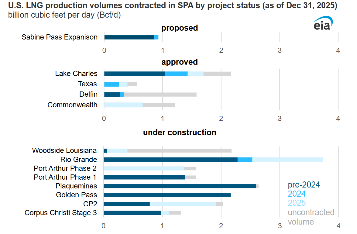 Největší objem kontraktů v roce 2025 zajistil projekt Port Arthur LNG Phase 2 s kapacitou 1,4 Bcf/d, následovaný projekty Rio Grande LNG (1,2 Bcf/d) a CP2 (1,1 Bcf/d). Významný podíl získal také Commonwealth LNG (0,7 Bcf/d). Tyto projekty mají hrát důležitou roli v budoucím růstu amerického exportu LNG. Velká většina kontraktů byla uzavřena na dlouhodobé období 20 let, přičemž přibližně 56 % objemu je navázáno na americký benchmark Henry Hub. Zbytek kontraktů je většinou navázán na ceny ropy Brent, což je běžná praxe v globálním LNG obchodě.