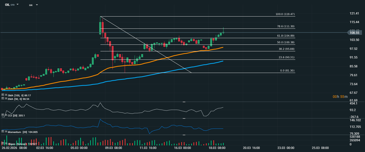Cena ropy pokračuje v růstovém pohybu a aktuálně se obchoduje kolem 108,55 USD, tedy nad klíčovou Fibonacciho úrovní 61,8 % na hodnotě 104,89 USD. Trh se zároveň drží nad oběma klouzavými průměry, když EMA 50 leží na 98,54 USD a SMA 100 na 89,17 USD, což potvrzuje pokračující býčí trend. Pozitivně působí i předchozí průraz klesající trendové linie, po kterém se cena postupně stabilizovala a znovu nabrala sílu k růstu. Dalším důležitým signálem je vývoj CCI, který se nachází na vysoké hodnotě kolem 205, což ukazuje na silné nákupní momentum, ale zároveň upozorňuje na možné krátkodobé přehřátí trhu. Momentum se drží nad úrovní 100, což rovněž podporuje pokračování růstového scénáře. Cena se nyní přibližuje k další významné rezistenci na 111,30 USD, která odpovídá Fibonacciho hladině 78,6 %. Její překonání by mohlo otevřít prostor pro test maxima na 119,47 USD.