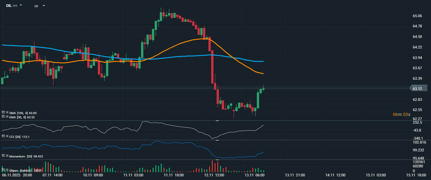 Ropa po prudkém výprodeji zaznamenala silný odraz od dna v oblasti 62,35 USD a aktuálně se obchoduje na 63,12 USD. CCI dosahuje 113,1, což značí krátkodobé překoupení, ale zároveň potvrzuje sílu nákupního tlaku. Momentum roste a drží se nad hodnotou 98, což indikuje pokračující dynamiku. Objem obchodů rovněž vzrostl při růstu, což podporuje validitu obratu.