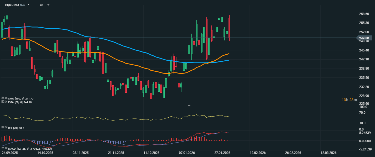 Akcie Equinor ASA se aktuálně obchodují na úrovni 249,80 NOK a po silném růstu v druhé polovině ledna přešly do fáze konsolidace v pásmu 246–256 NOK. Cena se momentálně drží nad oběma klouzavými průměry – EMA 50 (244,19 NOK) i SMA 100 (241,70 NOK), což signalizuje te Z hlediska technického vývoje je důležité, že se akcie Equinoru dokázaly dostat nad dlouhodobou sestupnou fázi, kterou zakončily průrazem nad SMA 100 v polovině ledna. Udržení nad hranicí 245 NOK (EMA 50) bude klíčové pro potvrzení nového růstového trendu. Naopak průraz pod tuto úroveň by mohl vyvolat návrat k úrovním kolem 238–240 NOK.