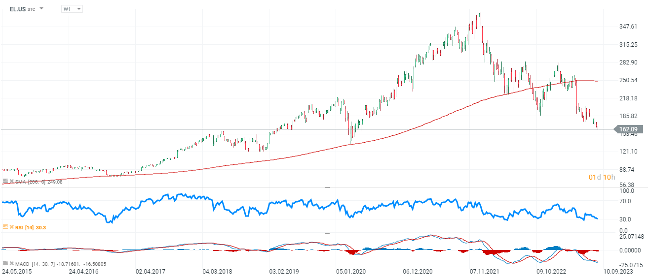 Indikátor RSI pro (EL.US) se na týdenním intervalu (W1) blíží extrémně přeprodaným úrovním, které se za posledních 8 let vyskytly pouze několikrát. Cena klesá do blízkosti úrovní z období poklesu v roce 2020. Před otevřením amerického trhu akcie společnosti ztrácejí 5 %. Zdroj: xStation5