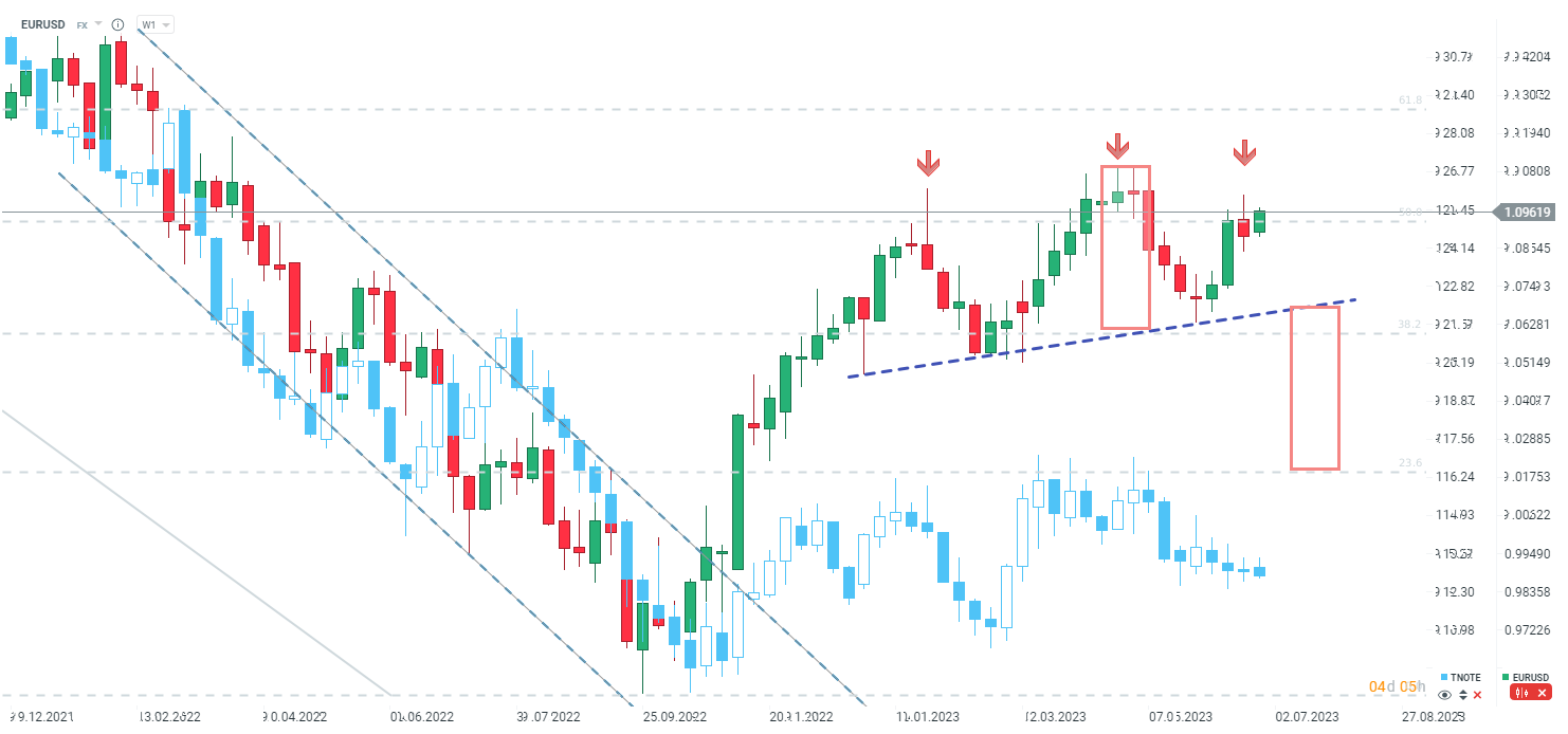 EURUSD se nadále obchoduje na vysokých úrovních, a to i navzdory pokračujícímu růstu výnosů v USA. Pokud EURUSD vystoupí nad lokální maximum z minulého týdne, potenciální formace hlava a ramena by byla znehodnocena. Zdroj: xStation5