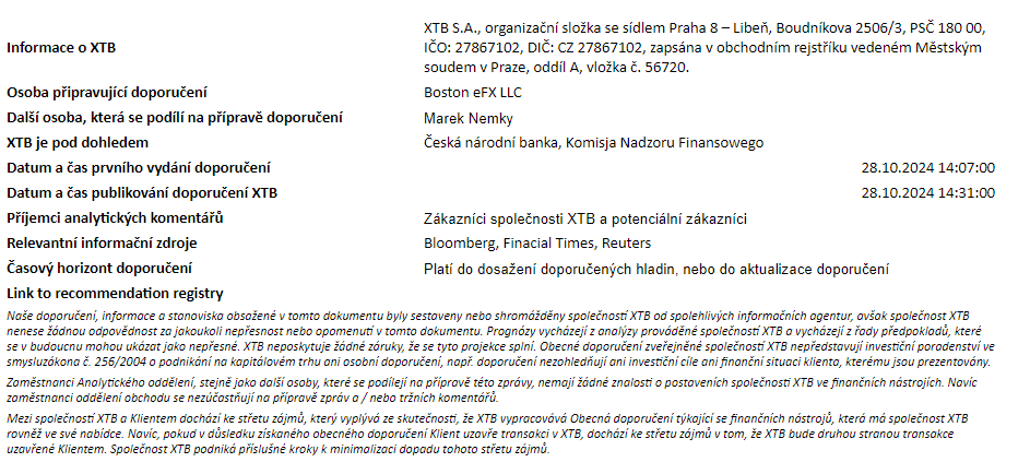 Rozdílové smlouvy jsou komplexní nástroje a v důsledku použití finanční páky jsou spojeny s vysokým rizikem rychlého vzniku finanční ztráty. U 71 % účtů retailových investorů došlo při obchodování s rozdílovými smlouvami u tohoto poskytovatele ke vzniku ztráty. Měli byste zvážit, zda rozumíte tomu, jak rozdílové smlouvy fungují, a zda si můžete dovolit vysoké riziko ztráty svých finančních prostředků. Investování je rizikové. Investujte zodpovědně. Tento materiál je marketingovou komunikací ve smyslu čl. 24 odst. 3 směrnice Evropského parlamentu a Rady 2014/65/EU ze dne 15. května 2014 o trzích finančních nástrojů, kterou se mění směrnice 2002/92/ES a směrnice 2011/61/EU (MiFID II). Marketingová komunikace není investiční doporučení ani informace doporučující či navrhující investiční strategii ve smyslu nařízení Evropského parlamentu a Rady (EU) č. 596/2014 ze dne 16. dubna 2014 o zneužívání trhu (nařízení o zneužívání trhu) a o zrušení směrnice Evropského parlamentu a Rady 2003/6/ES a směrnic Komise 2003/124/ES, 2003/125/ES a 2004/72/ES a nařízení Komise v přenesené pravomoci (EU) 2016/958 ze dne 9. března 2016, kterým se doplňuje nařízení Evropského parlamentu a Rady (EU) č. 596/2014, pokud jde o regulační technické normy pro technická ujednání pro objektivní předkládání investičních doporučení nebo jiných informací doporučujících nebo navrhujících investiční strategie a pro zveřejnění konkrétních zájmů nebo náznaků střetu zájmů nebo jakékoli jiné rady, a to i v oblasti investičního poradenství, ve smyslu zákona č. 256/2004 Sb., o podnikání na kapitálovém trhu. Marketingová komunikace je připravena s nejvyšší pečlivostí, objektivitou, prezentuje fakta známé autorovi k datu přípravy a neobsahuje žádné hodnotící prvky. Marketingová komunikace je připravena bez zohlednění potřeb klienta, jeho individuální finanční situace a nijak nepředstavuje investiční strategii. Marketingová komunikace nepředstavuje nabídku k prodeji, nabídku, předplatné, výzvu na nákup, reklamu nebo propagaci jakýchkoliv finančních nástrojů. Společnost XTB S.A., organizační složka nenese odpovědnost za jakékoli jednání nebo opomenutí klienta, zejména za získání nebo zcizení finančních nástrojů, na základě informací obsažených v této marketingové komunikaci. V případě, že marketingová komunikace obsahuje jakékoli informace o jakýchkoli výsledcích týkajících se finančních nástrojů v nich uvedených, nepředstavují žádnou záruku ani předpověď ohledně budoucích výsledků. Minulá výkonnost nemusí nutně vypovídat o budoucích výsledcích a každá osoba jednající na základě těchto informací tak činí zcela na vlastní riziko.