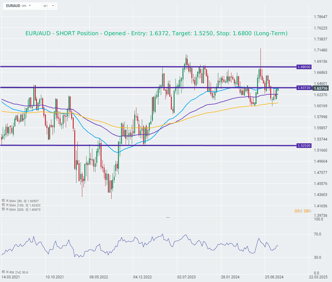 Morgan Stanley doporučuje zaujmout krátkou pozici na EURAUD za tržní cenu s cílem 1,5250 a stop loss příkazem na úrovni 1,6800. Zdroj: xStation5