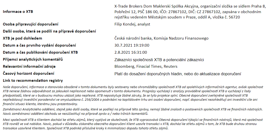 Rozdílové smlouvy jsou komplexní nástroje a v důsledku použití finanční páky jsou spojeny s vysokým rizikem rychlého vzniku finanční ztráty. U 71 % účtů retailových investorů došlo při obchodování s rozdílovými smlouvami u tohoto poskytovatele ke vzniku ztráty. Měli byste zvážit, zda rozumíte tomu, jak rozdílové smlouvy fungují, a zda si můžete dovolit vysoké riziko ztráty svých finančních prostředků. Investování je rizikové. Investujte zodpovědně. Tento materiál je marketingovou komunikací ve smyslu čl. 24 odst. 3 směrnice Evropského parlamentu a Rady 2014/65/EU ze dne 15. května 2014 o trzích finančních nástrojů, kterou se mění směrnice 2002/92/ES a směrnice 2011/61/EU (MiFID II). Marketingová komunikace není investiční doporučení ani informace doporučující či navrhující investiční strategii ve smyslu nařízení Evropského parlamentu a Rady (EU) č. 596/2014 ze dne 16. dubna 2014 o zneužívání trhu (nařízení o zneužívání trhu) a o zrušení směrnice Evropského parlamentu a Rady 2003/6/ES a směrnic Komise 2003/124/ES, 2003/125/ES a 2004/72/ES a nařízení Komise v přenesené pravomoci (EU) 2016/958 ze dne 9. března 2016, kterým se doplňuje nařízení Evropského parlamentu a Rady (EU) č. 596/2014, pokud jde o regulační technické normy pro technická ujednání pro objektivní předkládání investičních doporučení nebo jiných informací doporučujících nebo navrhujících investiční strategie a pro zveřejnění konkrétních zájmů nebo náznaků střetu zájmů nebo jakékoli jiné rady, a to i v oblasti investičního poradenství, ve smyslu zákona č. 256/2004 Sb., o podnikání na kapitálovém trhu. Marketingová komunikace je připravena s nejvyšší pečlivostí, objektivitou, prezentuje fakta známé autorovi k datu přípravy a neobsahuje žádné hodnotící prvky. Marketingová komunikace je připravena bez zohlednění potřeb klienta, jeho individuální finanční situace a nijak nepředstavuje investiční strategii. Marketingová komunikace nepředstavuje nabídku k prodeji, nabídku, předplatné, výzvu na nákup, reklamu nebo propagaci jakýchkoliv finančních nástrojů. Společnost XTB S.A., organizační složka nenese odpovědnost za jakékoli jednání nebo opomenutí klienta, zejména za získání nebo zcizení finančních nástrojů, na základě informací obsažených v této marketingové komunikaci. V případě, že marketingová komunikace obsahuje jakékoli informace o jakýchkoli výsledcích týkajících se finančních nástrojů v nich uvedených, nepředstavují žádnou záruku ani předpověď ohledně budoucích výsledků. Minulá výkonnost nemusí nutně vypovídat o budoucích výsledcích a každá osoba jednající na základě těchto informací tak činí zcela na vlastní riziko.