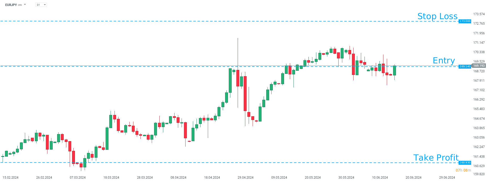 Credit Agricole doporučuje zaujmout krátkou pozici na EURJPY za tržní cenu s cílem 162,50 a stop loss příkazem umístěným na 171,10. Zdroj: xStation5