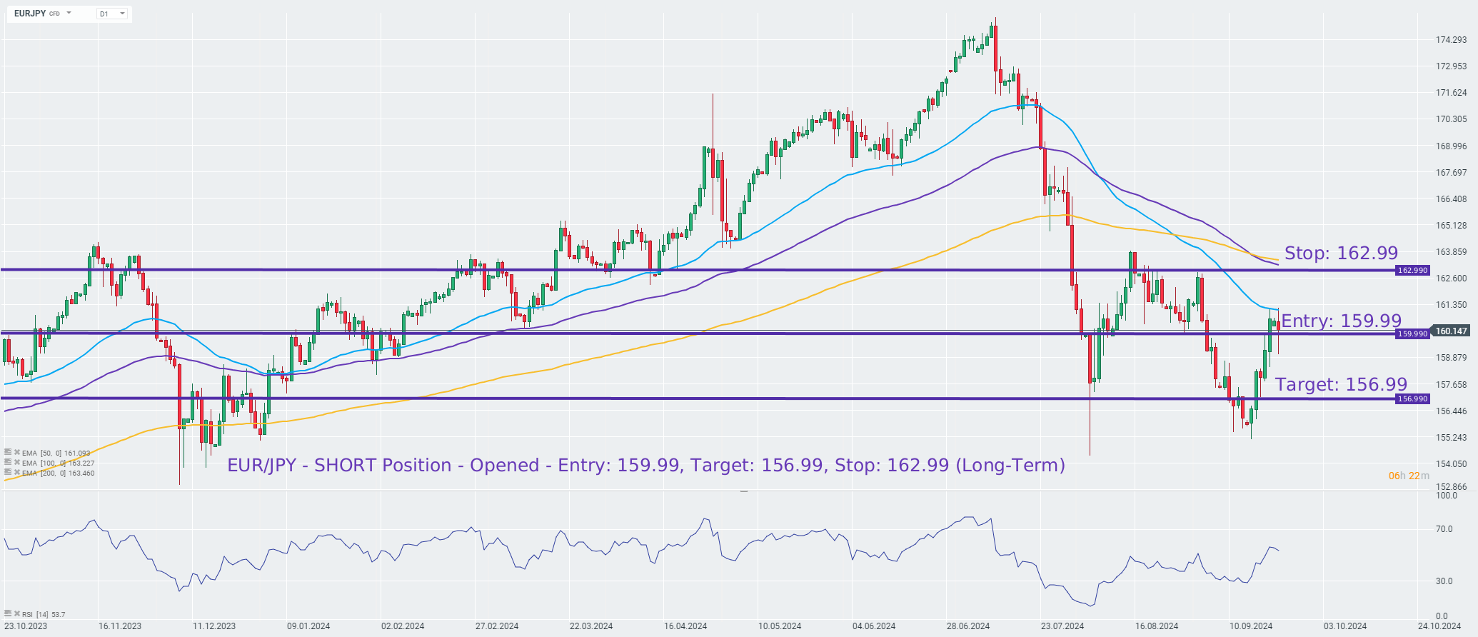 Credit Agricole doporučuje zaujmout krátkou pozici na EURJPY za tržní cenu s cílem 156,99 a stop loss příkazem na 162,99. Zdroj: xStation5