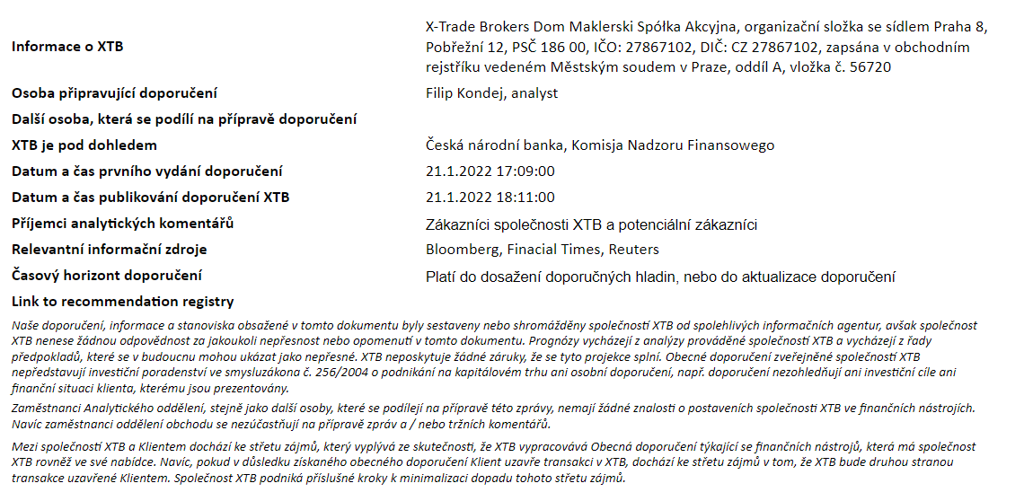 Rozdílové smlouvy jsou komplexní nástroje a v důsledku použití finanční páky jsou spojeny s vysokým rizikem rychlého vzniku finanční ztráty. U 71 % účtů retailových investorů došlo při obchodování s rozdílovými smlouvami u tohoto poskytovatele ke vzniku ztráty. Měli byste zvážit, zda rozumíte tomu, jak rozdílové smlouvy fungují, a zda si můžete dovolit vysoké riziko ztráty svých finančních prostředků. Investování je rizikové. Investujte zodpovědně. Tento materiál je marketingovou komunikací ve smyslu čl. 24 odst. 3 směrnice Evropského parlamentu a Rady 2014/65/EU ze dne 15. května 2014 o trzích finančních nástrojů, kterou se mění směrnice 2002/92/ES a směrnice 2011/61/EU (MiFID II). Marketingová komunikace není investiční doporučení ani informace doporučující či navrhující investiční strategii ve smyslu nařízení Evropského parlamentu a Rady (EU) č. 596/2014 ze dne 16. dubna 2014 o zneužívání trhu (nařízení o zneužívání trhu) a o zrušení směrnice Evropského parlamentu a Rady 2003/6/ES a směrnic Komise 2003/124/ES, 2003/125/ES a 2004/72/ES a nařízení Komise v přenesené pravomoci (EU) 2016/958 ze dne 9. března 2016, kterým se doplňuje nařízení Evropského parlamentu a Rady (EU) č. 596/2014, pokud jde o regulační technické normy pro technická ujednání pro objektivní předkládání investičních doporučení nebo jiných informací doporučujících nebo navrhujících investiční strategie a pro zveřejnění konkrétních zájmů nebo náznaků střetu zájmů nebo jakékoli jiné rady, a to i v oblasti investičního poradenství, ve smyslu zákona č. 256/2004 Sb., o podnikání na kapitálovém trhu. Marketingová komunikace je připravena s nejvyšší pečlivostí, objektivitou, prezentuje fakta známé autorovi k datu přípravy a neobsahuje žádné hodnotící prvky. Marketingová komunikace je připravena bez zohlednění potřeb klienta, jeho individuální finanční situace a nijak nepředstavuje investiční strategii. Marketingová komunikace nepředstavuje nabídku k prodeji, nabídku, předplatné, výzvu na nákup, reklamu nebo propagaci jakýchkoliv finančních nástrojů. Společnost XTB S.A., organizační složka nenese odpovědnost za jakékoli jednání nebo opomenutí klienta, zejména za získání nebo zcizení finančních nástrojů, na základě informací obsažených v této marketingové komunikaci. V případě, že marketingová komunikace obsahuje jakékoli informace o jakýchkoli výsledcích týkajících se finančních nástrojů v nich uvedených, nepředstavují žádnou záruku ani předpověď ohledně budoucích výsledků. Minulá výkonnost nemusí nutně vypovídat o budoucích výsledcích a každá osoba jednající na základě těchto informací tak činí zcela na vlastní riziko.