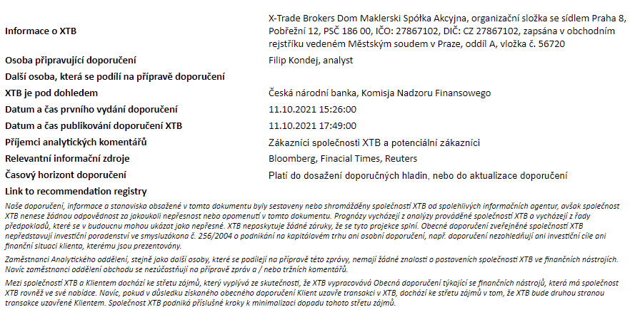 Rozdílové smlouvy jsou komplexní nástroje a v důsledku použití finanční páky jsou spojeny s vysokým rizikem rychlého vzniku finanční ztráty. U 71 % účtů retailových investorů došlo při obchodování s rozdílovými smlouvami u tohoto poskytovatele ke vzniku ztráty. Měli byste zvážit, zda rozumíte tomu, jak rozdílové smlouvy fungují, a zda si můžete dovolit vysoké riziko ztráty svých finančních prostředků. Investování je rizikové. Investujte zodpovědně. Tento materiál je marketingovou komunikací ve smyslu čl. 24 odst. 3 směrnice Evropského parlamentu a Rady 2014/65/EU ze dne 15. května 2014 o trzích finančních nástrojů, kterou se mění směrnice 2002/92/ES a směrnice 2011/61/EU (MiFID II). Marketingová komunikace není investiční doporučení ani informace doporučující či navrhující investiční strategii ve smyslu nařízení Evropského parlamentu a Rady (EU) č. 596/2014 ze dne 16. dubna 2014 o zneužívání trhu (nařízení o zneužívání trhu) a o zrušení směrnice Evropského parlamentu a Rady 2003/6/ES a směrnic Komise 2003/124/ES, 2003/125/ES a 2004/72/ES a nařízení Komise v přenesené pravomoci (EU) 2016/958 ze dne 9. března 2016, kterým se doplňuje nařízení Evropského parlamentu a Rady (EU) č. 596/2014, pokud jde o regulační technické normy pro technická ujednání pro objektivní předkládání investičních doporučení nebo jiných informací doporučujících nebo navrhujících investiční strategie a pro zveřejnění konkrétních zájmů nebo náznaků střetu zájmů nebo jakékoli jiné rady, a to i v oblasti investičního poradenství, ve smyslu zákona č. 256/2004 Sb., o podnikání na kapitálovém trhu. Marketingová komunikace je připravena s nejvyšší pečlivostí, objektivitou, prezentuje fakta známé autorovi k datu přípravy a neobsahuje žádné hodnotící prvky. Marketingová komunikace je připravena bez zohlednění potřeb klienta, jeho individuální finanční situace a nijak nepředstavuje investiční strategii. Marketingová komunikace nepředstavuje nabídku k prodeji, nabídku, předplatné, výzvu na nákup, reklamu nebo propagaci jakýchkoliv finančních nástrojů. Společnost XTB S.A., organizační složka nenese odpovědnost za jakékoli jednání nebo opomenutí klienta, zejména za získání nebo zcizení finančních nástrojů, na základě informací obsažených v této marketingové komunikaci. V případě, že marketingová komunikace obsahuje jakékoli informace o jakýchkoli výsledcích týkajících se finančních nástrojů v nich uvedených, nepředstavují žádnou záruku ani předpověď ohledně budoucích výsledků. Minulá výkonnost nemusí nutně vypovídat o budoucích výsledcích a každá osoba jednající na základě těchto informací tak činí zcela na vlastní riziko.