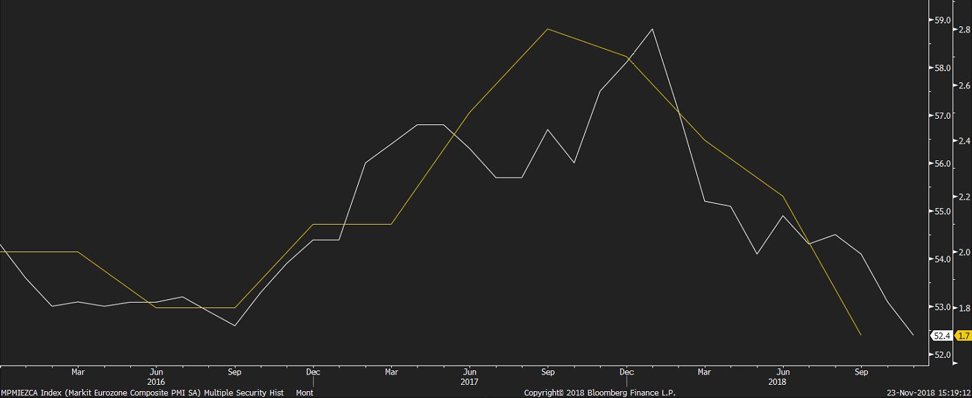Séria slabých dát z eurozóny pokračuje. Dnes sklamali všetky relevantné čísla z podnikovej dôvery z eurozóny a jej najväčších ekonomík. Kompozitný index dôvery (výroba+služby) klesol na úroveň 52,4., čo je najmenej za posledných 2,5 roka. Je však potrebné dodať, že index je stále nad úrovňou 50b., ktorý oddeľuje rast od poklesu. Aktivita v podnikovej sfére teda rastie, avšak stále pomalšie a pomalšie.
