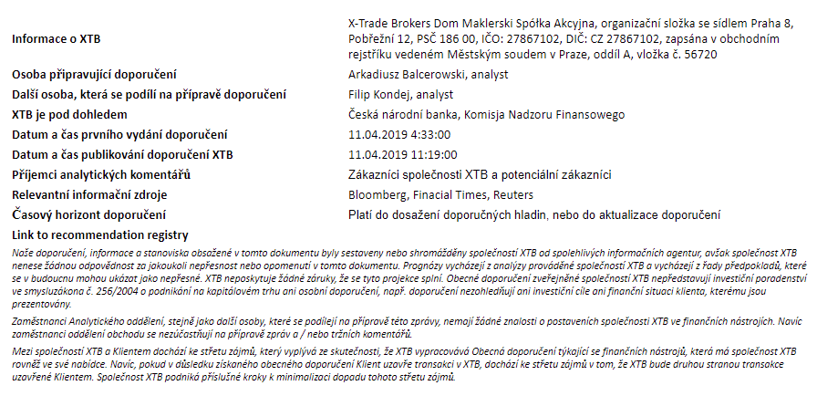 Rozdílové smlouvy jsou komplexní nástroje a v důsledku použití finanční páky jsou spojeny s vysokým rizikem rychlého vzniku finanční ztráty. U 71 % účtů retailových investorů došlo při obchodování s rozdílovými smlouvami u tohoto poskytovatele ke vzniku ztráty. Měli byste zvážit, zda rozumíte tomu, jak rozdílové smlouvy fungují, a zda si můžete dovolit vysoké riziko ztráty svých finančních prostředků. Investování je rizikové. Investujte zodpovědně. Tento materiál je marketingovou komunikací ve smyslu čl. 24 odst. 3 směrnice Evropského parlamentu a Rady 2014/65/EU ze dne 15. května 2014 o trzích finančních nástrojů, kterou se mění směrnice 2002/92/ES a směrnice 2011/61/EU (MiFID II). Marketingová komunikace není investiční doporučení ani informace doporučující či navrhující investiční strategii ve smyslu nařízení Evropského parlamentu a Rady (EU) č. 596/2014 ze dne 16. dubna 2014 o zneužívání trhu (nařízení o zneužívání trhu) a o zrušení směrnice Evropského parlamentu a Rady 2003/6/ES a směrnic Komise 2003/124/ES, 2003/125/ES a 2004/72/ES a nařízení Komise v přenesené pravomoci (EU) 2016/958 ze dne 9. března 2016, kterým se doplňuje nařízení Evropského parlamentu a Rady (EU) č. 596/2014, pokud jde o regulační technické normy pro technická ujednání pro objektivní předkládání investičních doporučení nebo jiných informací doporučujících nebo navrhujících investiční strategie a pro zveřejnění konkrétních zájmů nebo náznaků střetu zájmů nebo jakékoli jiné rady, a to i v oblasti investičního poradenství, ve smyslu zákona č. 256/2004 Sb., o podnikání na kapitálovém trhu. Marketingová komunikace je připravena s nejvyšší pečlivostí, objektivitou, prezentuje fakta známé autorovi k datu přípravy a neobsahuje žádné hodnotící prvky. Marketingová komunikace je připravena bez zohlednění potřeb klienta, jeho individuální finanční situace a nijak nepředstavuje investiční strategii. Marketingová komunikace nepředstavuje nabídku k prodeji, nabídku, předplatné, výzvu na nákup, reklamu nebo propagaci jakýchkoliv finančních nástrojů. Společnost XTB S.A., organizační složka nenese odpovědnost za jakékoli jednání nebo opomenutí klienta, zejména za získání nebo zcizení finančních nástrojů, na základě informací obsažených v této marketingové komunikaci. V případě, že marketingová komunikace obsahuje jakékoli informace o jakýchkoli výsledcích týkajících se finančních nástrojů v nich uvedených, nepředstavují žádnou záruku ani předpověď ohledně budoucích výsledků. Minulá výkonnost nemusí nutně vypovídat o budoucích výsledcích a každá osoba jednající na základě těchto informací tak činí zcela na vlastní riziko.
