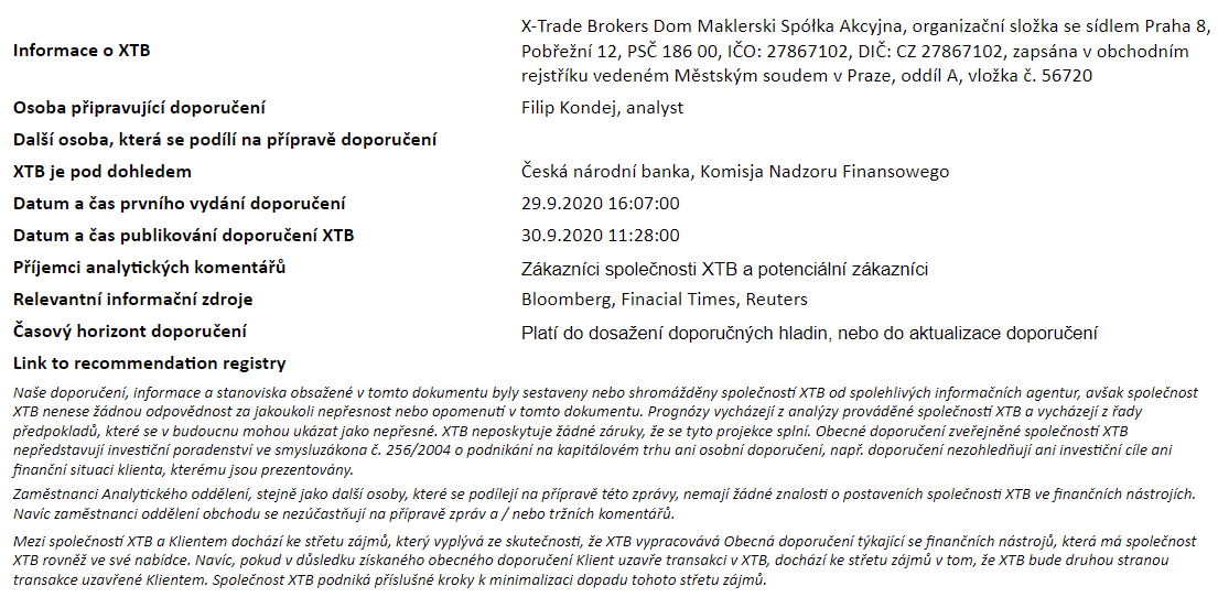 Rozdílové smlouvy jsou komplexní nástroje a v důsledku použití finanční páky jsou spojeny s vysokým rizikem rychlého vzniku finanční ztráty. U 71 % účtů retailových investorů došlo při obchodování s rozdílovými smlouvami u tohoto poskytovatele ke vzniku ztráty. Měli byste zvážit, zda rozumíte tomu, jak rozdílové smlouvy fungují, a zda si můžete dovolit vysoké riziko ztráty svých finančních prostředků. Investování je rizikové. Investujte zodpovědně. Tento materiál je marketingovou komunikací ve smyslu čl. 24 odst. 3 směrnice Evropského parlamentu a Rady 2014/65/EU ze dne 15. května 2014 o trzích finančních nástrojů, kterou se mění směrnice 2002/92/ES a směrnice 2011/61/EU (MiFID II). Marketingová komunikace není investiční doporučení ani informace doporučující či navrhující investiční strategii ve smyslu nařízení Evropského parlamentu a Rady (EU) č. 596/2014 ze dne 16. dubna 2014 o zneužívání trhu (nařízení o zneužívání trhu) a o zrušení směrnice Evropského parlamentu a Rady 2003/6/ES a směrnic Komise 2003/124/ES, 2003/125/ES a 2004/72/ES a nařízení Komise v přenesené pravomoci (EU) 2016/958 ze dne 9. března 2016, kterým se doplňuje nařízení Evropského parlamentu a Rady (EU) č. 596/2014, pokud jde o regulační technické normy pro technická ujednání pro objektivní předkládání investičních doporučení nebo jiných informací doporučujících nebo navrhujících investiční strategie a pro zveřejnění konkrétních zájmů nebo náznaků střetu zájmů nebo jakékoli jiné rady, a to i v oblasti investičního poradenství, ve smyslu zákona č. 256/2004 Sb., o podnikání na kapitálovém trhu. Marketingová komunikace je připravena s nejvyšší pečlivostí, objektivitou, prezentuje fakta známé autorovi k datu přípravy a neobsahuje žádné hodnotící prvky. Marketingová komunikace je připravena bez zohlednění potřeb klienta, jeho individuální finanční situace a nijak nepředstavuje investiční strategii. Marketingová komunikace nepředstavuje nabídku k prodeji, nabídku, předplatné, výzvu na nákup, reklamu nebo propagaci jakýchkoliv finančních nástrojů. Společnost XTB S.A., organizační složka nenese odpovědnost za jakékoli jednání nebo opomenutí klienta, zejména za získání nebo zcizení finančních nástrojů, na základě informací obsažených v této marketingové komunikaci. V případě, že marketingová komunikace obsahuje jakékoli informace o jakýchkoli výsledcích týkajících se finančních nástrojů v nich uvedených, nepředstavují žádnou záruku ani předpověď ohledně budoucích výsledků. Minulá výkonnost nemusí nutně vypovídat o budoucích výsledcích a každá osoba jednající na základě těchto informací tak činí zcela na vlastní riziko.