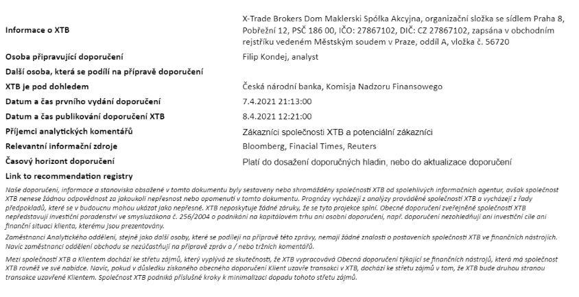 Rozdílové smlouvy jsou komplexní nástroje a v důsledku použití finanční páky jsou spojeny s vysokým rizikem rychlého vzniku finanční ztráty. U 71 % účtů retailových investorů došlo při obchodování s rozdílovými smlouvami u tohoto poskytovatele ke vzniku ztráty. Měli byste zvážit, zda rozumíte tomu, jak rozdílové smlouvy fungují, a zda si můžete dovolit vysoké riziko ztráty svých finančních prostředků. Investování je rizikové. Investujte zodpovědně. Tento materiál je marketingovou komunikací ve smyslu čl. 24 odst. 3 směrnice Evropského parlamentu a Rady 2014/65/EU ze dne 15. května 2014 o trzích finančních nástrojů, kterou se mění směrnice 2002/92/ES a směrnice 2011/61/EU (MiFID II). Marketingová komunikace není investiční doporučení ani informace doporučující či navrhující investiční strategii ve smyslu nařízení Evropského parlamentu a Rady (EU) č. 596/2014 ze dne 16. dubna 2014 o zneužívání trhu (nařízení o zneužívání trhu) a o zrušení směrnice Evropského parlamentu a Rady 2003/6/ES a směrnic Komise 2003/124/ES, 2003/125/ES a 2004/72/ES a nařízení Komise v přenesené pravomoci (EU) 2016/958 ze dne 9. března 2016, kterým se doplňuje nařízení Evropského parlamentu a Rady (EU) č. 596/2014, pokud jde o regulační technické normy pro technická ujednání pro objektivní předkládání investičních doporučení nebo jiných informací doporučujících nebo navrhujících investiční strategie a pro zveřejnění konkrétních zájmů nebo náznaků střetu zájmů nebo jakékoli jiné rady, a to i v oblasti investičního poradenství, ve smyslu zákona č. 256/2004 Sb., o podnikání na kapitálovém trhu. Marketingová komunikace je připravena s nejvyšší pečlivostí, objektivitou, prezentuje fakta známé autorovi k datu přípravy a neobsahuje žádné hodnotící prvky. Marketingová komunikace je připravena bez zohlednění potřeb klienta, jeho individuální finanční situace a nijak nepředstavuje investiční strategii. Marketingová komunikace nepředstavuje nabídku k prodeji, nabídku, předplatné, výzvu na nákup, reklamu nebo propagaci jakýchkoliv finančních nástrojů. Společnost XTB S.A., organizační složka nenese odpovědnost za jakékoli jednání nebo opomenutí klienta, zejména za získání nebo zcizení finančních nástrojů, na základě informací obsažených v této marketingové komunikaci. V případě, že marketingová komunikace obsahuje jakékoli informace o jakýchkoli výsledcích týkajících se finančních nástrojů v nich uvedených, nepředstavují žádnou záruku ani předpověď ohledně budoucích výsledků. Minulá výkonnost nemusí nutně vypovídat o budoucích výsledcích a každá osoba jednající na základě těchto informací tak činí zcela na vlastní riziko.