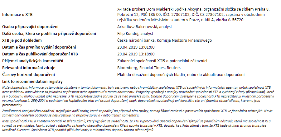 Rozdílové smlouvy jsou komplexní nástroje a v důsledku použití finanční páky jsou spojeny s vysokým rizikem rychlého vzniku finanční ztráty. U 71 % účtů retailových investorů došlo při obchodování s rozdílovými smlouvami u tohoto poskytovatele ke vzniku ztráty. Měli byste zvážit, zda rozumíte tomu, jak rozdílové smlouvy fungují, a zda si můžete dovolit vysoké riziko ztráty svých finančních prostředků. Investování je rizikové. Investujte zodpovědně. Tento materiál je marketingovou komunikací ve smyslu čl. 24 odst. 3 směrnice Evropského parlamentu a Rady 2014/65/EU ze dne 15. května 2014 o trzích finančních nástrojů, kterou se mění směrnice 2002/92/ES a směrnice 2011/61/EU (MiFID II). Marketingová komunikace není investiční doporučení ani informace doporučující či navrhující investiční strategii ve smyslu nařízení Evropského parlamentu a Rady (EU) č. 596/2014 ze dne 16. dubna 2014 o zneužívání trhu (nařízení o zneužívání trhu) a o zrušení směrnice Evropského parlamentu a Rady 2003/6/ES a směrnic Komise 2003/124/ES, 2003/125/ES a 2004/72/ES a nařízení Komise v přenesené pravomoci (EU) 2016/958 ze dne 9. března 2016, kterým se doplňuje nařízení Evropského parlamentu a Rady (EU) č. 596/2014, pokud jde o regulační technické normy pro technická ujednání pro objektivní předkládání investičních doporučení nebo jiných informací doporučujících nebo navrhujících investiční strategie a pro zveřejnění konkrétních zájmů nebo náznaků střetu zájmů nebo jakékoli jiné rady, a to i v oblasti investičního poradenství, ve smyslu zákona č. 256/2004 Sb., o podnikání na kapitálovém trhu. Marketingová komunikace je připravena s nejvyšší pečlivostí, objektivitou, prezentuje fakta známé autorovi k datu přípravy a neobsahuje žádné hodnotící prvky. Marketingová komunikace je připravena bez zohlednění potřeb klienta, jeho individuální finanční situace a nijak nepředstavuje investiční strategii. Marketingová komunikace nepředstavuje nabídku k prodeji, nabídku, předplatné, výzvu na nákup, reklamu nebo propagaci jakýchkoliv finančních nástrojů. Společnost XTB S.A., organizační složka nenese odpovědnost za jakékoli jednání nebo opomenutí klienta, zejména za získání nebo zcizení finančních nástrojů, na základě informací obsažených v této marketingové komunikaci. V případě, že marketingová komunikace obsahuje jakékoli informace o jakýchkoli výsledcích týkajících se finančních nástrojů v nich uvedených, nepředstavují žádnou záruku ani předpověď ohledně budoucích výsledků. Minulá výkonnost nemusí nutně vypovídat o budoucích výsledcích a každá osoba jednající na základě těchto informací tak činí zcela na vlastní riziko.