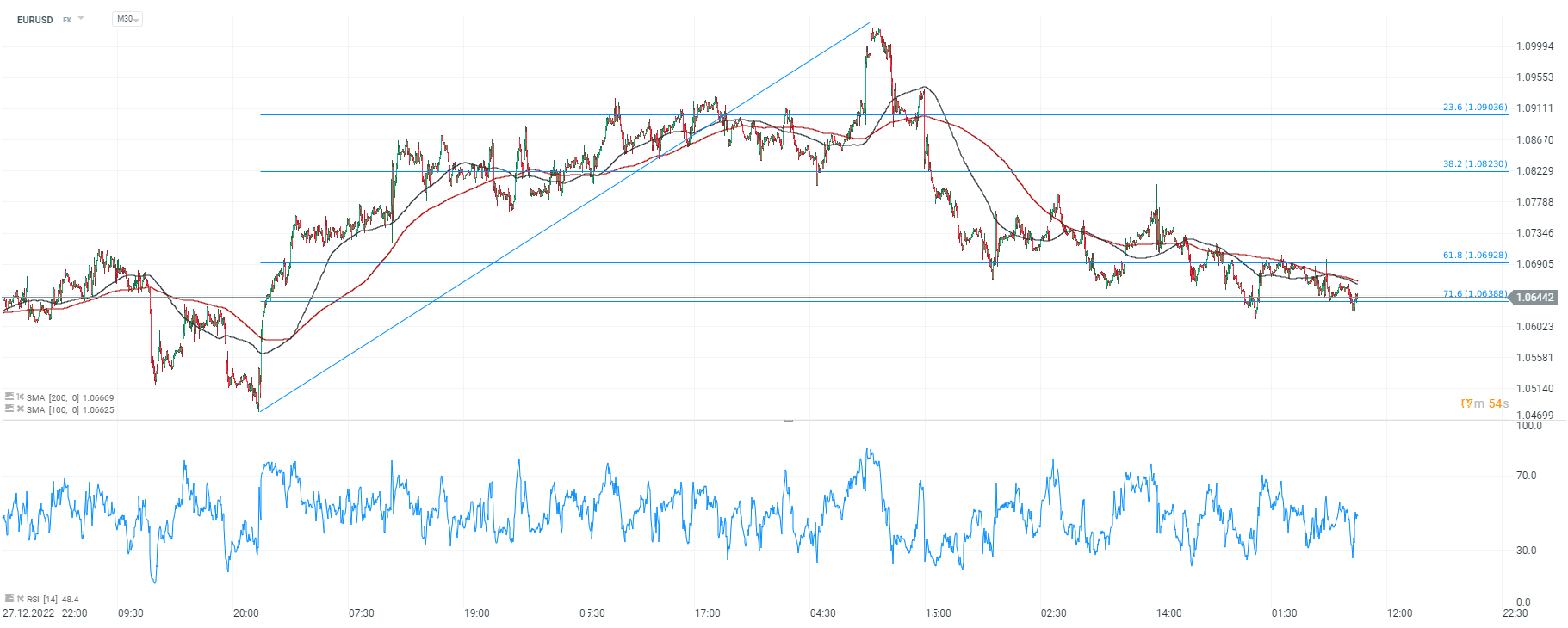 EURUSD po Bullardově komentáři oslabil a přiblížil se oblasti, kde byl naposledy k vidění 17. února a dříve na začátku ledna. Hlavní rezistenci vyznačuje klouzavý průměr 200 seancí (červená linie) a 38,2 Fibonacciho retracementu poblíž úrovně 1,07. Býci se budou snažit odrazit od současné úrovně 1,064, která se shoduje s úrovní 71,6 Fibonacciho retracementu vzestupné vlny započaté 8. ledna 2023. Ukazatel RSI se nachází na neutrální úrovni 48 bodů.