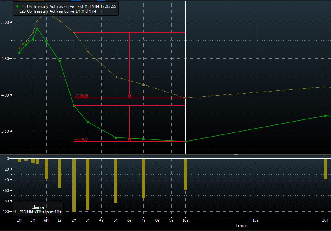 V USA pozorujeme zplošťování křivky. Bude květnové zvýšení sazeb poslední a Fed se začne připravovat na snížení sazeb na konci roku, což umožní další pokles dvouletých dluhopisů? Zdroj: Bloomberg