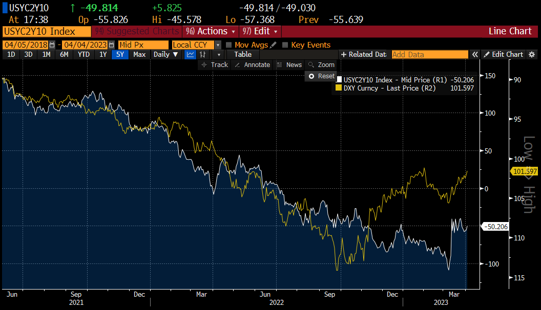 Silný signál naznačující ochlazení trhu práce stačil k výraznému oslabení amerického dolaru. Tento pohyb lze pozorovat i na trhu amerických dluhopisů, kde jsme svědky postupného zplošťování křivky. Stojí za povšimnutí, že před měsícem činil spread mezi dvouletými a desetiletými výnosy 90 bazických bodů a nyní je to 50 bazických bodů. Samozřejmě stále máme záporný spread 10Y-2Y a to je ukazatel potenciální blížící se recese.
