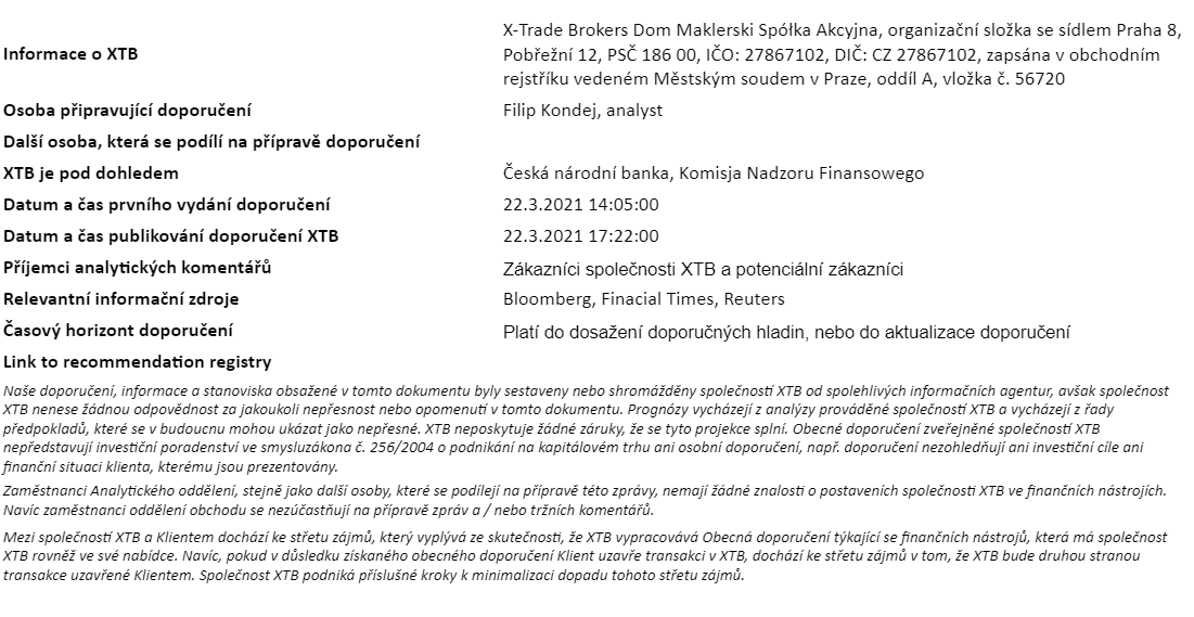Rozdílové smlouvy jsou komplexní nástroje a v důsledku použití finanční páky jsou spojeny s vysokým rizikem rychlého vzniku finanční ztráty. U 71 % účtů retailových investorů došlo při obchodování s rozdílovými smlouvami u tohoto poskytovatele ke vzniku ztráty. Měli byste zvážit, zda rozumíte tomu, jak rozdílové smlouvy fungují, a zda si můžete dovolit vysoké riziko ztráty svých finančních prostředků. Investování je rizikové. Investujte zodpovědně. Tento materiál je marketingovou komunikací ve smyslu čl. 24 odst. 3 směrnice Evropského parlamentu a Rady 2014/65/EU ze dne 15. května 2014 o trzích finančních nástrojů, kterou se mění směrnice 2002/92/ES a směrnice 2011/61/EU (MiFID II). Marketingová komunikace není investiční doporučení ani informace doporučující či navrhující investiční strategii ve smyslu nařízení Evropského parlamentu a Rady (EU) č. 596/2014 ze dne 16. dubna 2014 o zneužívání trhu (nařízení o zneužívání trhu) a o zrušení směrnice Evropského parlamentu a Rady 2003/6/ES a směrnic Komise 2003/124/ES, 2003/125/ES a 2004/72/ES a nařízení Komise v přenesené pravomoci (EU) 2016/958 ze dne 9. března 2016, kterým se doplňuje nařízení Evropského parlamentu a Rady (EU) č. 596/2014, pokud jde o regulační technické normy pro technická ujednání pro objektivní předkládání investičních doporučení nebo jiných informací doporučujících nebo navrhujících investiční strategie a pro zveřejnění konkrétních zájmů nebo náznaků střetu zájmů nebo jakékoli jiné rady, a to i v oblasti investičního poradenství, ve smyslu zákona č. 256/2004 Sb., o podnikání na kapitálovém trhu. Marketingová komunikace je připravena s nejvyšší pečlivostí, objektivitou, prezentuje fakta známé autorovi k datu přípravy a neobsahuje žádné hodnotící prvky. Marketingová komunikace je připravena bez zohlednění potřeb klienta, jeho individuální finanční situace a nijak nepředstavuje investiční strategii. Marketingová komunikace nepředstavuje nabídku k prodeji, nabídku, předplatné, výzvu na nákup, reklamu nebo propagaci jakýchkoliv finančních nástrojů. Společnost XTB S.A., organizační složka nenese odpovědnost za jakékoli jednání nebo opomenutí klienta, zejména za získání nebo zcizení finančních nástrojů, na základě informací obsažených v této marketingové komunikaci. V případě, že marketingová komunikace obsahuje jakékoli informace o jakýchkoli výsledcích týkajících se finančních nástrojů v nich uvedených, nepředstavují žádnou záruku ani předpověď ohledně budoucích výsledků. Minulá výkonnost nemusí nutně vypovídat o budoucích výsledcích a každá osoba jednající na základě těchto informací tak činí zcela na vlastní riziko.