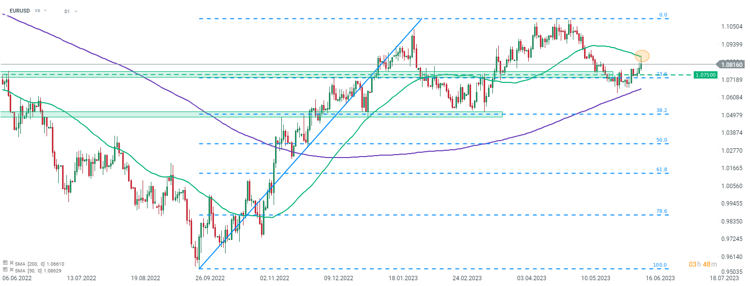 Měnový pár EURUSD nedokázal prolomit klouzavý průměr 50 seancí (zelená linie) v oblasti 1,0850 a po "jestřábí" pauze Fedu začal umazávat denní zisky. Zdroj: xStation5