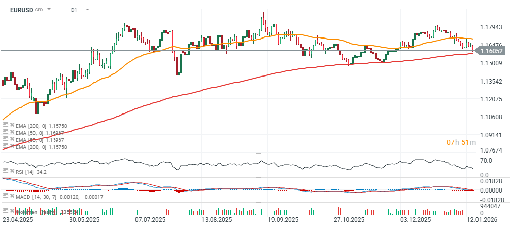 EUR/USD oslabuje směrem k 1,16, přičemž pokles se zpomaluje poblíž 200periodního EMA (červená linie, 1,157), úrovně, od které se trh dvakrát v nedávné době odrazil.