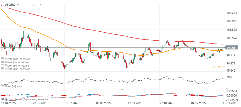 Futures na index amerického dolaru (USDIDX) rostou na úrovně nevídané od první poloviny prosince, čímž korigují část prudkého poklesu z konce roku 2025. Index zaznamenal sérii růstových seancí v posledních týdnech, přerušenou pouze krátkými výběry zisků.