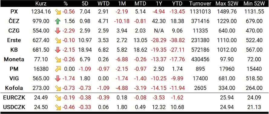 Evropská komise dnes představila návrh na regulaci energetického trhu. Na celoevropské zastropování cen elektřiny na 180 EUR za MWh reagovaly akcie ČEZ (CEZ1.CZ) pozitivně, ačkoliv se tuzemské energetické skupiny bude týkat i daň z mimořádných zisků. Na pesimistickou vlnu přeskočily banky. Nejvýkonnější akcie posledního týdne, Komerční banka (KOMB.CZ), poklesla o 2,15 % a uzavřela na 681,5 Kč na akcii. Konkurenční ERSTE (RBAG.CZ) a Moneta (MONET.CZ) odepsaly jen nižší desetiny procent.
