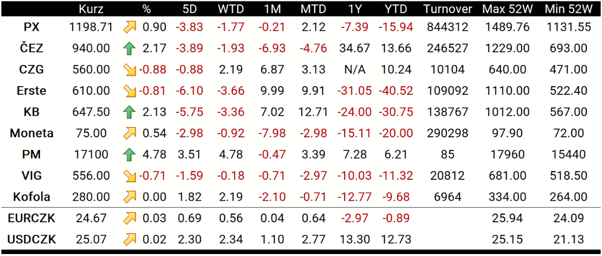 Kurzy indexu pražské burzy a akcií po uzavření čtvrteční seance. Nejvýkonnějším titulem byl Philip Morris (TABAK.CZ). Zdroj: Bloomberg