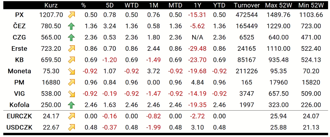 Nejvýkonnějším titulem indexu PX se dnes stala Kofola (KOFOL.CZ), která uzavřela seanci o 2,46 % výše. Podobný růst si dnes připsala i Česká zbrojovka (CZG.CZ), jež vzrostla o 2,36 % na 565 korun za akcii. Banky se dnes obchodovaly smíšeně. Zatímco Moneta (MONET.CZ) ztratila 0,92 % ze své tržní kapitalizace, Komerční banka (KOMB.CZ) i Erste (RBAG.CZ) vzrostly o 0,69 %, resp. 0,86 %. ČEZ (CEZ1.CZ) posílil o 1,36 % na 780,50 Kč za akcii.