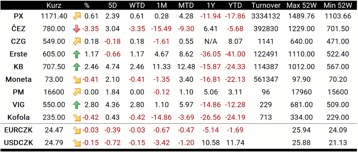 Nejvýkonnějším titulem se dnes stala Vienna Insurance Group (VIG.CZ), který si připsal 2,80 %. O méně výkonnější byla Komerční banka (KOMB.CZ), jež uzavřela na 707,50 Kč, tedy s 2,46% ziskem. Nejztrátovější akcií se dnes stal ČEZ (CEZ1.CZ). Ten reagoval na neustálé požadavky Pirátské strany o zavedení daně z mimořádných zisků již za letošní rok. Celková ztáta činila 3,35 % a akcie uzavřely na 780 Kč.