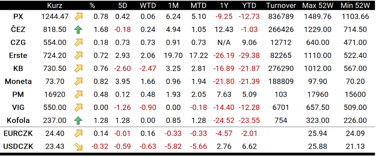 Dnes po uzavření pražského trhu zveřejnila své výsledky za 3. čtvrtletí a 9 měsíců roku Kofola (KOFOL.CZ). Společnost ve 3. kvartále utržila 2,35 mld., což bylo v souladu s odhady. Čistý zisk na akcii se pak meziročně propadl o 30 % na 8,27 Kč na akcii. Akcie společnosti uzavřely dnešní seanci s 1,28% ziskem na 237 kč. Nejvýkonnějším titulem pražského indexu se dnes stal ČEZ (CEZ1.CZ), jež si připsal 1,68 % a senaci zakončil na 818,50 Kč. Banky se dnes taktéž obchodovaly se zisky.