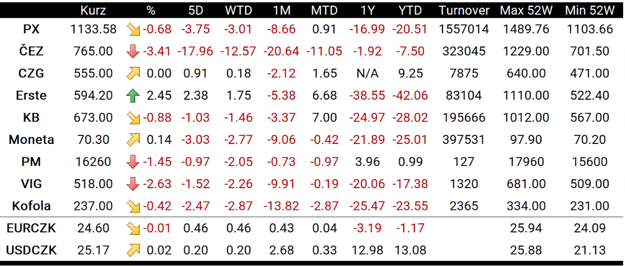 Kurzy indexu pražské burzy a akcií po uzavření čtvrteční seance. Nejvýkonnějším titulem byla opět ERSTE (RBAG.CZ). Zdroj: Bloomberg