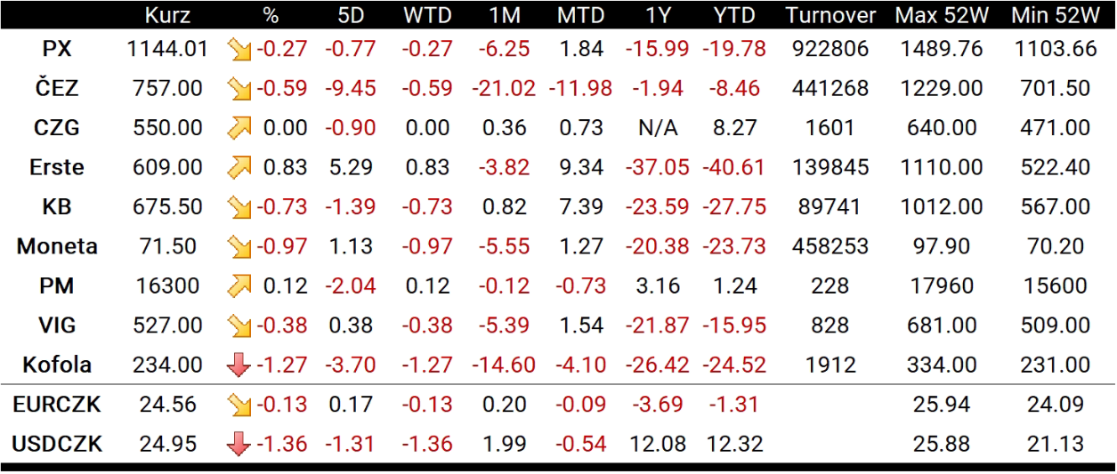 Nejvýkonnějším titulem pražské burzy se dnes stala ERSTE (RBAG.CZ). Ratingová společnost Fitch dnes potvrdila rating společnosti “A” se stabilním výhledem. Zbylé banky z indexu PX si dnes vedly o poznání hůře. Zatímco Komerční banka (KOMB.CZ) odepsala 0,73 %, Moneta (MONET.CZ) ztratila téměř 1 % a seanci ukončila na 71,50 Kč za akcii. V poklesech dnes pokračoval i ČEZ (CEZ1.CZ), který navázal na neúspěšný minulý týden a ztratil 0,59 %.