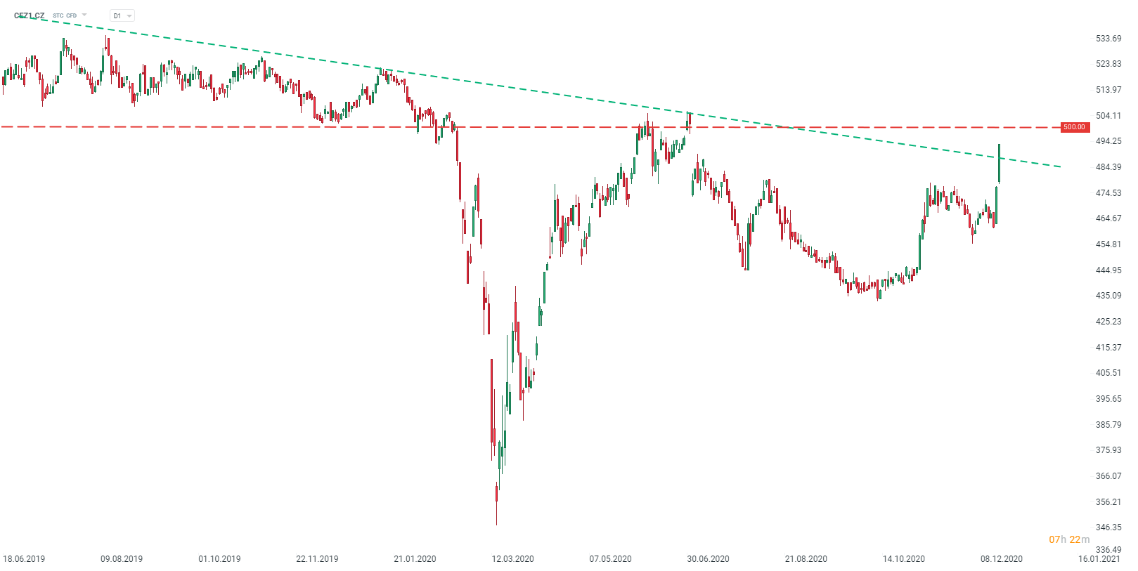Cena akcií ČEZu (CEZ1.CZ) překonala dvoudenním extrémním růstem dlouhodobou klesající trendovou čáru. Zároveň se však blíží hladina rezistence v blízkosti kulaté hladiny 500 Kč. Zdroj: xStation5
