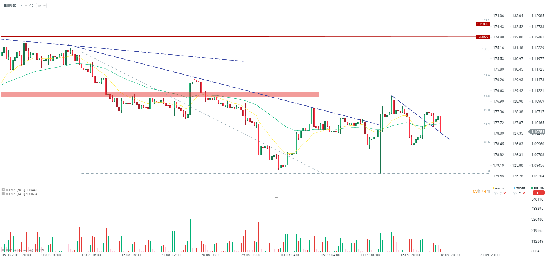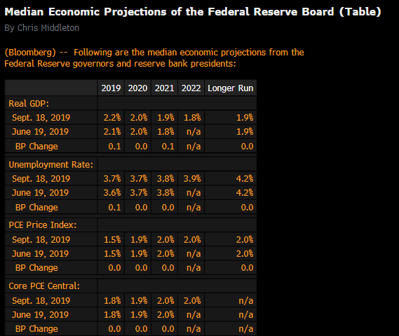Fed snížil dle očekávání hlavní úrokovou sazbu o 25 bp na 2,00 % z 2,25 %. Navíc dle tečkového grafu (dot chart) očekává 7 členů FOMC další snížení do konce roku. Medián výše sazeb na rok 2019 a 2020 však klesl pouze na 1,9 %, což by indikovalo, že žádné další změny sazeb se už nechystají. Makroekonomický výhled zůstal podobný předchozímu vydání. Americký dolar bezprostředně po rozhodnutí o sazbách roste.