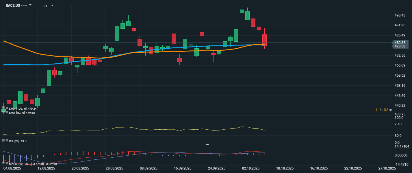 Akcie společnosti Ferrari se po oznámení konzervativního výhledu prudce propadly a aktuálně se obchodují na úrovni 478,68 USD. Tím se dostaly těsně pod důležité technické úrovně, konkrétně pod klouzavé průměry EMA 50 (479,65 USD) a SMA 100 (479,24 USD), které dosud sloužily jako podpora. Proražení těchto hladin může naznačovat oslabení býčího trendu a zvýšené riziko dalšího poklesu. RSI kleslo na hodnotu 49,0, což je neutrální úroveň, ale směr dolů potvrzuje rostoucí prodejní tlak. MACD se nachází pod signální linií a vstoupil do negativního teritoria (−3,02), což dále potvrzuje zhoršující se momentum a převahu medvědů.